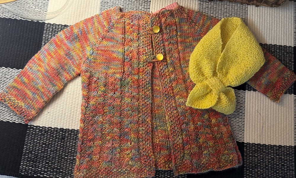 How adorable is this sweater and scarflet set for baby?! We are gushing at these pieces! Details: Handknit British Wool Multi-colored baby sweater with vintage buttons Handknit yellow scarflet