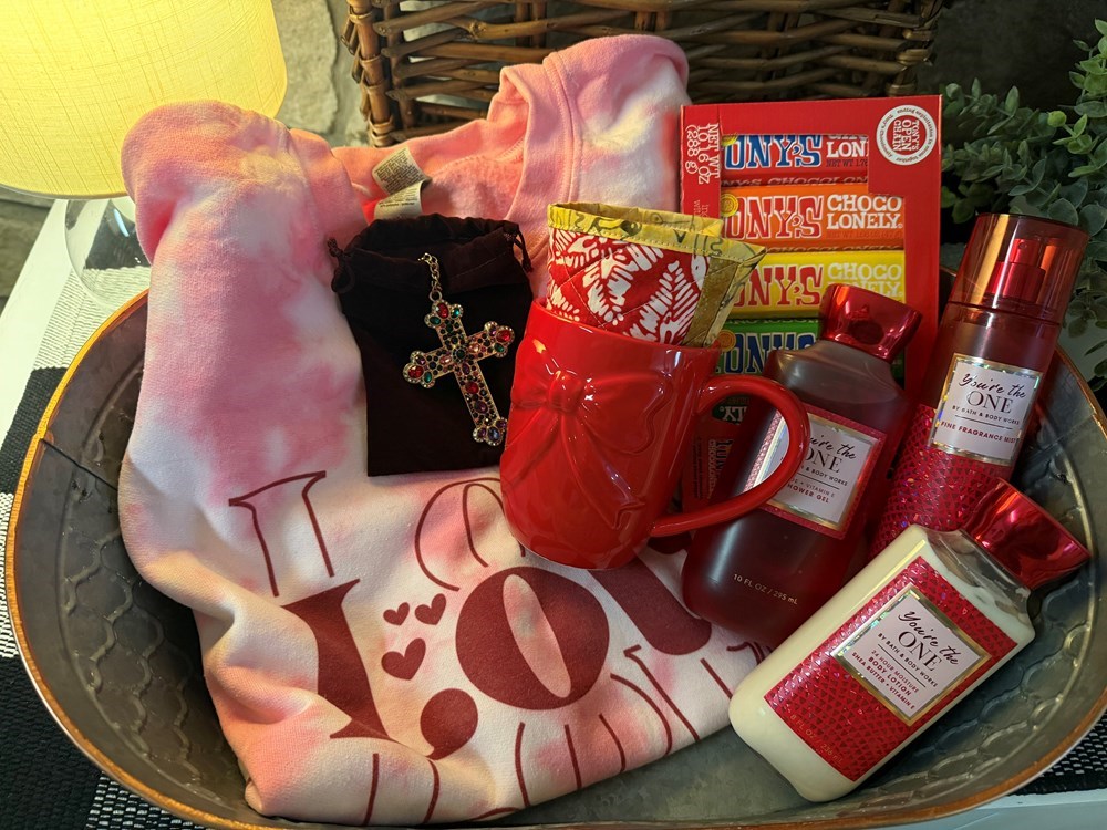 This basket proclaims "Be My Valentine!" Includes: XL Love Tie-Dye Sweatshirt Coffee Mug and Mug Rug Tony's Chocolonely set "You're the One" Bath and Bodyworks Set (3 products) Cross fashion necklace