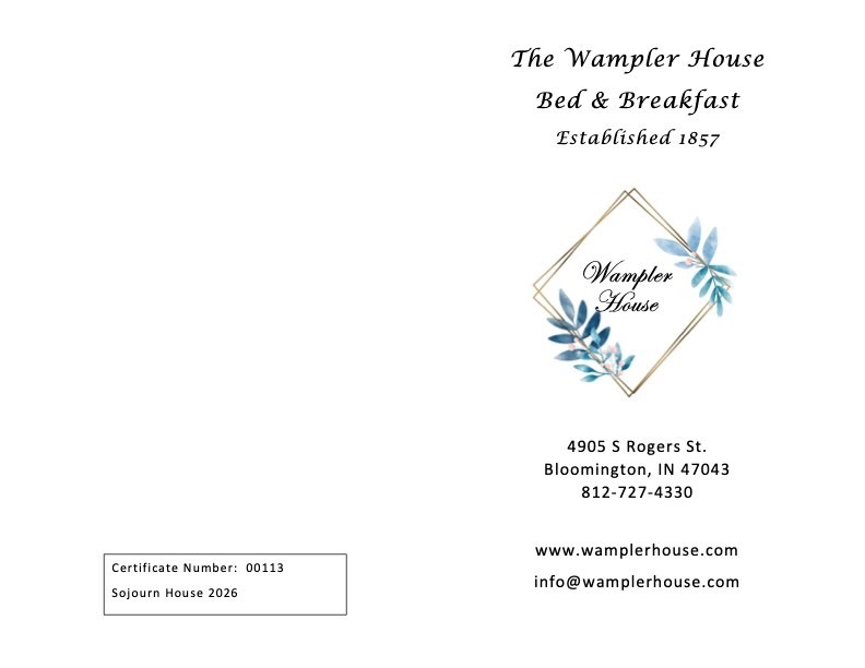Enjoy a night at The Wampler House Bed & Breakfast in Bloomington! Includes: 1 Night Free stay in a Queen Room with Fireplace, Jacuzzi Tub, and Free Breakfast. Optional 2nd night for 50% if desired. Excludes IU event weekends, expires February 28t h 2027 Call 812-727-4330 to reserve