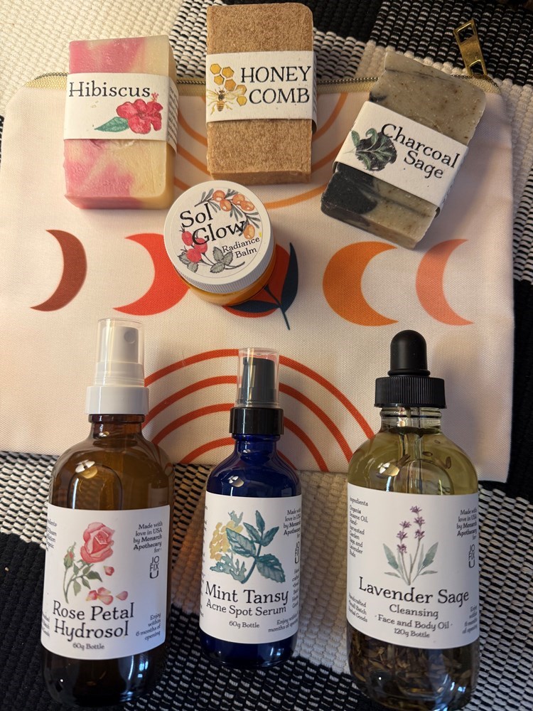 For that natural product-loving person in your life, this local and handmade brand - Monarch Apothecary - is sure to rejuvenate. Rose Petal Hydrosol - 60g bottle Lavender Sage Cleansing Oil for face and body - 120g bottle Sol Glow Radiance Balm Mint Tansy Acne Spot Serum - 60g bottle 3 bars of soap (Charcoal Sage, Honey Comb, & Hibiscus) Essentials zipper pouch
