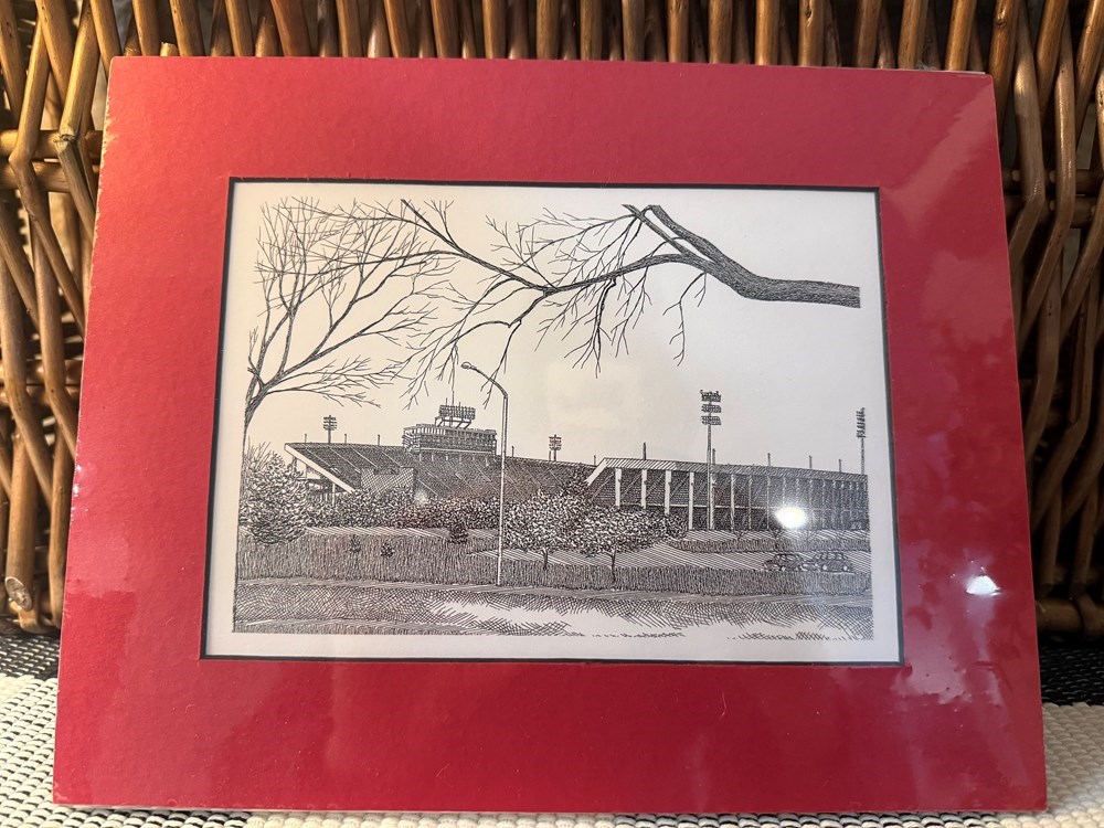 5x7 matted print of Memorial Stadium artwork, pen and ink, by artist Mark Riggins.
